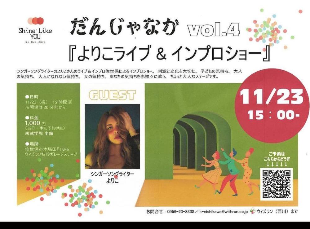 シンガーソングライターのよりこさんのライブ&インプロ佐世保によるインプロショー。刺激と変化を大切に、子どもの気持ち、大人の気持ち、大人になれない気持ち、女の気持ち、あなたの気持ちを赤裸々に歌う、ちょっと大人なステージです。