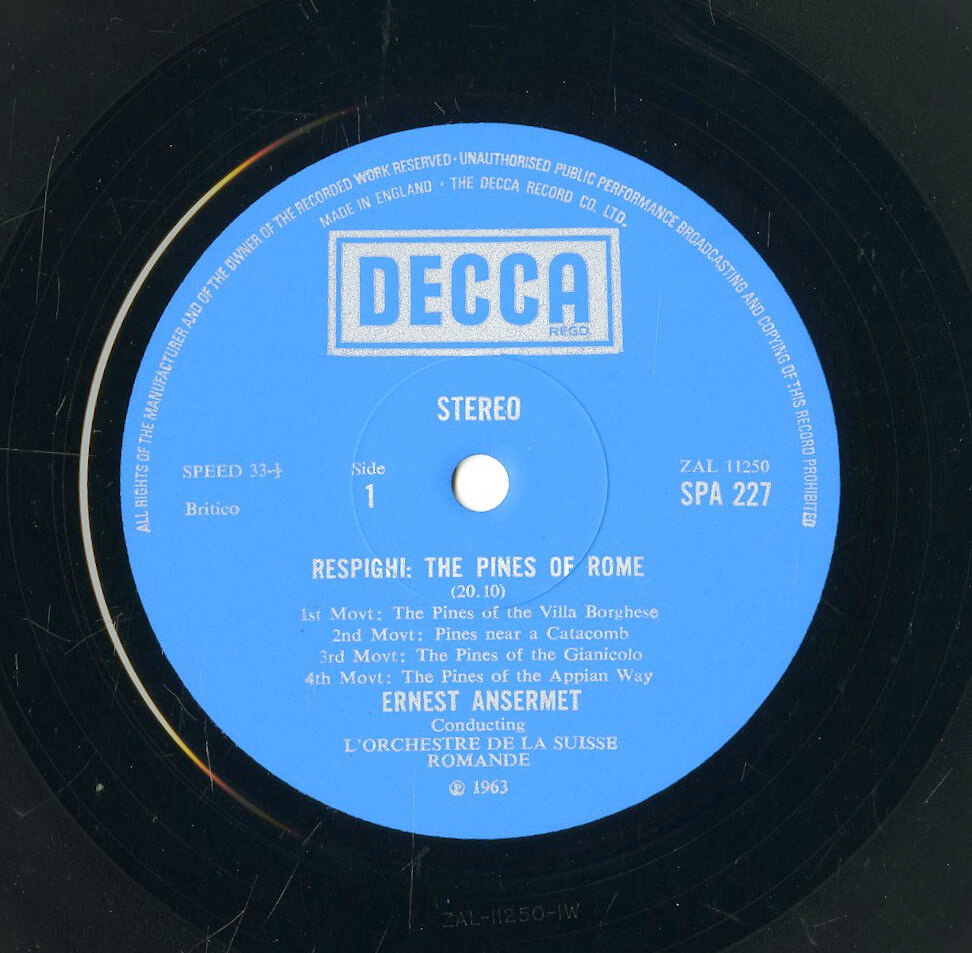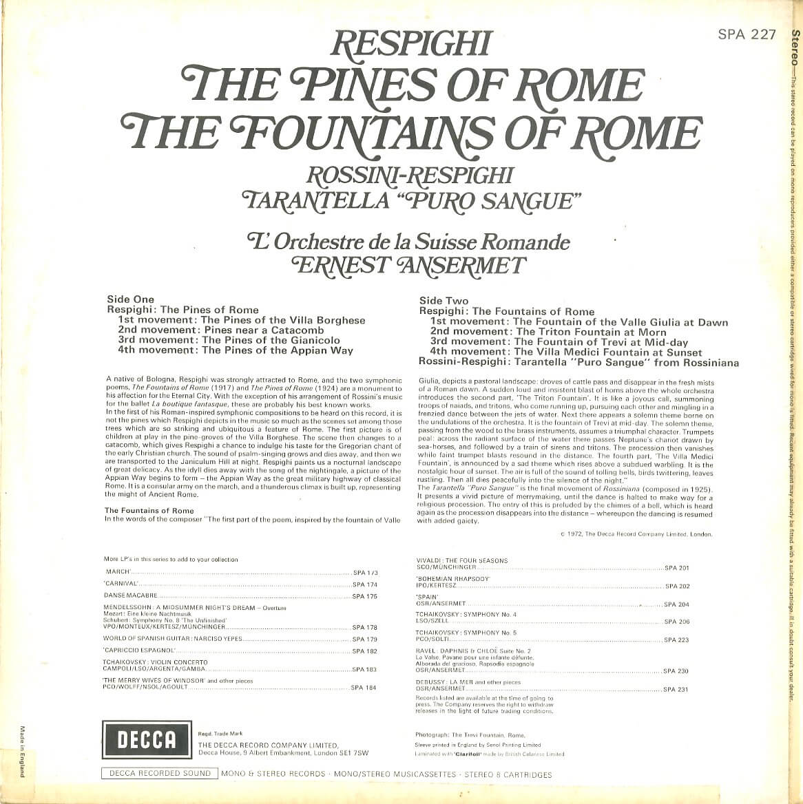 エルネスト・アンセルメ スイス・ロマンド管弦楽団 レスピーギ ローマの松 ローマの噴水 GB DECCA SPA227