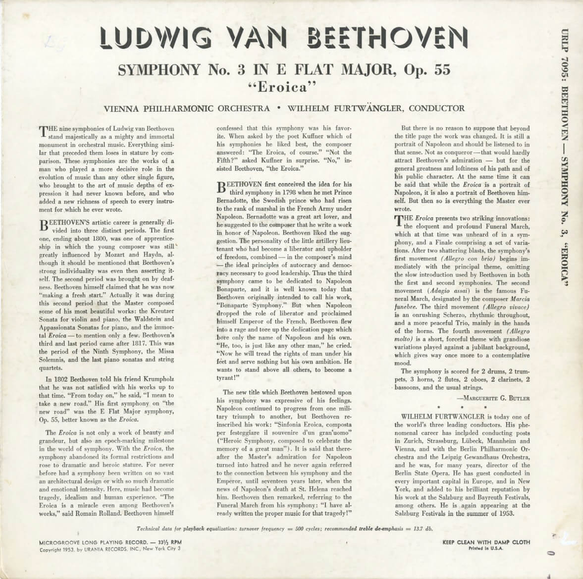 US URANIA URLP7095 ヴィルヘルム・フルトヴェングラー ウィーン・フィルハーモニー管弦楽団 ベートーヴェン 交響曲3番「英雄」