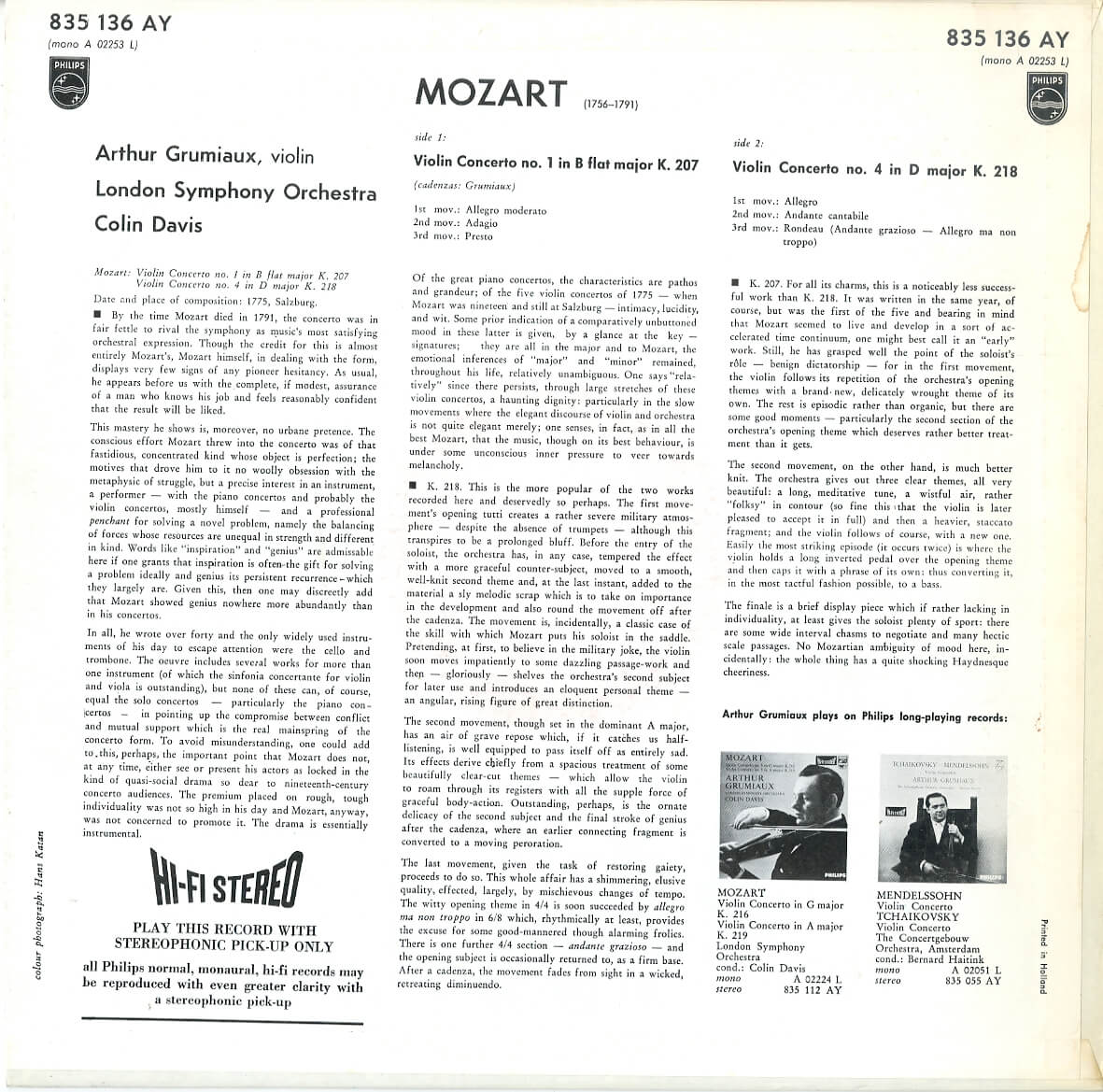 NL PHILIPS 835 136AY アルテュール・グリュミオー コリン・デイヴィス ロンドン交響楽団 モーツァルト ヴァイオリン協奏曲1番/4番