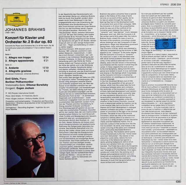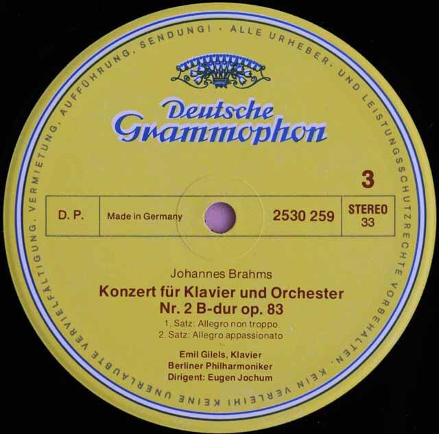 DE DGG 2530 259 エミール・ギレリス オイゲン・ヨッフム ベルリン・フィルハーモニー管弦楽団 ブラームス ピアノ協奏曲2番