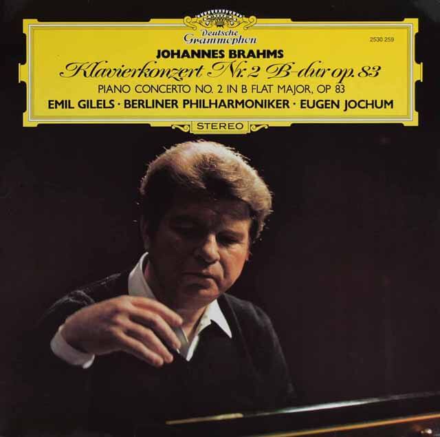 エミール・ギレリスの協奏曲録音のなかで、重要な位置を占める名盤の誉れ高い1972年6月録音。優秀録音です。〝鋼鉄のピアニスト〟と呼ばれるだけあり、力感に満ちた表現を聴かせます。ただ、やり過ぎという感じはなく、ベルリン・フィルハーモニー管弦楽団と共に強い構成感を感じます。さらにオイゲン・ヨッフムとベルリン・フィルが絶妙なアンサンブルで、素晴らしいブラームスを奏でている。オーケストラやピアノの力量のすごいことはわかる。でも、こういうふうにやらなくても、ブラームスの圧倒的な凄さは現せるので、この演奏のよさがわからない。それでも、骨太のピアノとベルリン・フィルの完璧なアンサンブルは素晴らしい。名ピアニストの故ギレリス(Emil Gilels, 1916年10月19日ウクライナ、オデーサ〜1985年10月14日ロシア、モスクワ)は強靱なタッチで迫力ある演奏を聴かせるばかりでなく、とっても繊細でロマンティックな所もあり、その対比が絶妙で実に素晴らしい。おそらくヨッフムとの相性も良いのだと思います。同時期にヨッフムはドレスデン国立管弦楽団とブルックナーの全集をEMIに入れている。ヨッフムがベルリン・フィルから見事なブラームス・トーンを引き出し、重厚感たっぷりの演奏を聴かせ、ドッシリ構えてギレリスをサポートしています。ブラームスのピアノ協奏曲は、オーケストラが重要な役割を果たす場面が連続する作品で、それだけに指揮者とオーケストラには、まるで交響曲のような演奏のグレードが求められるため、これまで名盤といわれてきたものの多くが、有名オーケストラと指揮者によるものだったのも頷けるところです。そうした名盤群の中でも、もっと気骨のある演奏が聴きたいと思ったとき、本盤は最適な巡り合わせとなる。このギレリスと名指揮者ヨッフム指揮ベルリン・フィルによる演奏で、パワフルなピアノと、オーケストラの壮大な演奏が、図抜けた存在感を示していたものでした。20世紀ドイツを代表する名匠ヨッフム(1902〜1987)は、1902年11月バーベンハウゼン生まれ。ドイツ・グラモフォンへ数多くの録音を特に1950、1960年代という壮年期に行っています。ベートーヴェン、ブラームス、ブルックナーという三大Bの作品では、最も熱く、渋く、重厚、そしてロマンティックで熱情的な演奏は、現在においても名盤として称賛され続けています。従来のピアノ協奏曲とは一線を画した〝ピアノ付き交響曲〟といった趣の、気宇広大ともいえるスケールがある。抑制された沈鬱感が横溢する晦渋さを湛えた作品。ヨッフムとベルリン・フィルの純ドイツ的な響きも聴きもの。