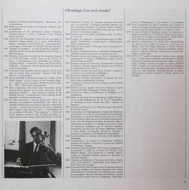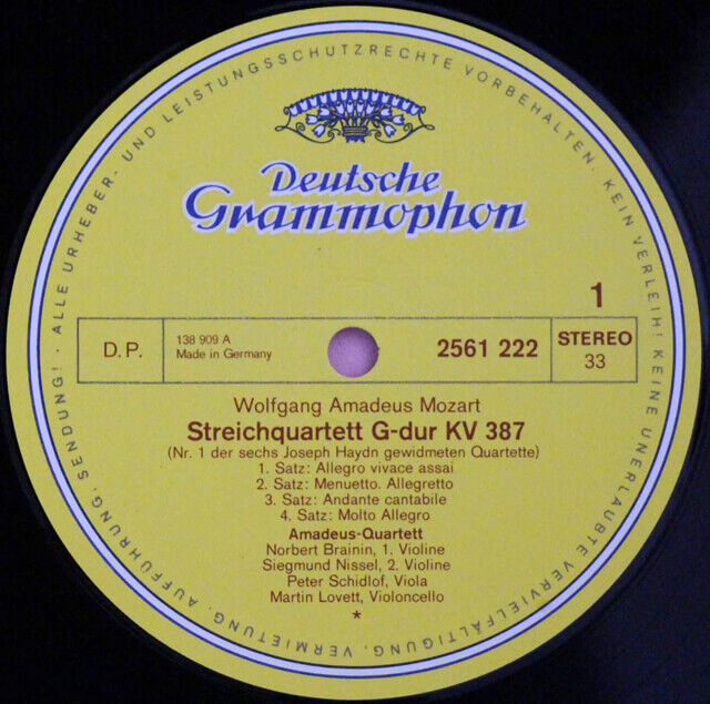 ― アマデウス弦楽四重奏団は1948年に結成され、1987年に活動が停止するまで、約40年もの長きにわたり演奏活動を続けてきました。このモーツァルト弦楽四重奏曲のレコードは、彼らが最も充実した時期に録音されたもので、不朽の名演として知られてきたものです。モーツァルトの弦楽四重奏曲全集というものの、今では第14番(K.387)から23番(K.590)とナンバリングされている後期弦楽四重奏曲のこと。SPレコードが一般的になるまではクラシック音楽とは西洋の知識や精神を理解した「インテリ」の愛好する音楽である、というイメージが付与されることとなった。それがレコード文化の一般化で小難しさはわからなくてもその調べを楽しむ文化は形成されていった。ところがそれは、LPレコードからCDという、より簡易に演奏を紹介できるメディアの登場で、ピリオド楽器での演奏から、ピリオド奏法での演奏へと、またもレコードを聞く他に、スコアを読む等、学問的な態度でクラシック音楽を愛好する傾向に戻ろうとしている。SPレコードからデジタル録音の初期まで、音楽の受容に沿う如くにアマデウス弦楽四重奏団の演奏スタイルは変化を重ねている。
