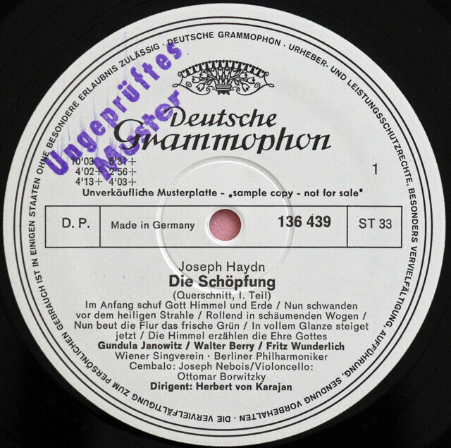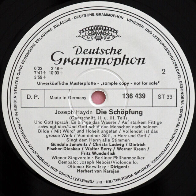 DE DGG 136 439 ヘルベルト・フォン・カラヤン グンドゥラ・ヤノヴィッツ クリスタ・ルートヴィヒ フリッツ・ヴンダーリヒ ウェルナー・クレン ディートリヒ・フィッシャー=ディースカウ ワルター・ベリー ベルリン・フィルハーモニー管弦楽団 ウィーン楽友協会合唱団 ハイドン 天地創造 抜粋