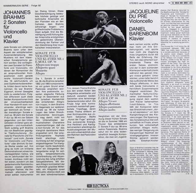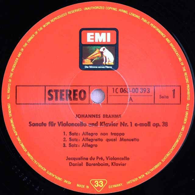 DE EMI 1C 063-00 393 ジャクリーヌ・デュ=プレ(チェロ)、ダニエル・バレンボイム(ピアノ) ブラームス・チェロ・ソナタ1番/2番