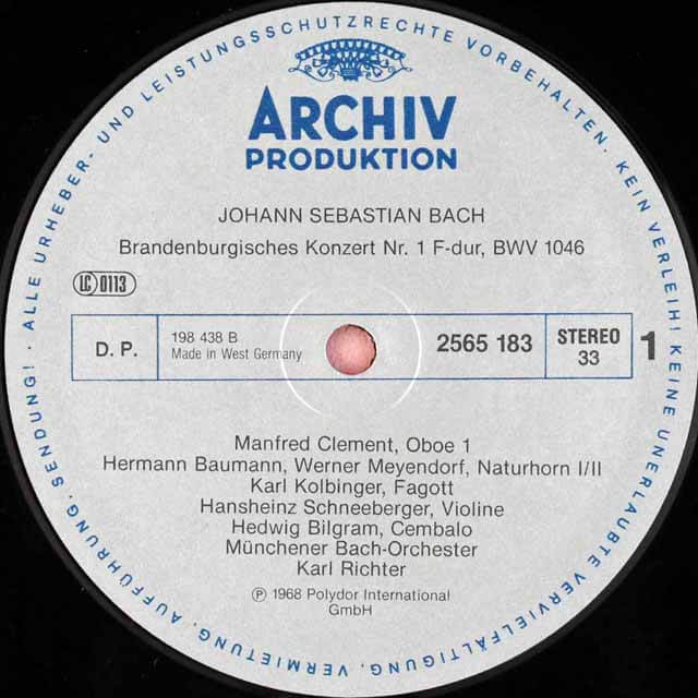 演奏者オーレル・ニコレ(フルート)、カール=ハインツ・シュネーベルガー(ヴァイオリン)、クルト=クリスティアーン・シュティアー(ヴィオラ)、オスヴァルト・ウール(ガンバ)、ヨハネス・フィンク(ガンバ)、フリッツ・キスカルト(チェロ)、ヘルベルト・ドゥフト(ダブルベース)、マンフレート・クレメント(オーボエ)、ヘルマン・バウマン(ホルン)、ヴェルナー・マイヤードルフ(ホルン)、カール・コルビンガー(ファゴット)、ハンス・マルティン・リンデ(リコーダー)、ギュンター・ヘラー(リコーダー)、ピエール・ティボー(トランペット)、ヘトヴィヒ・ビルグラム(チェンバロ)、カール・リヒター(チェンバロ)