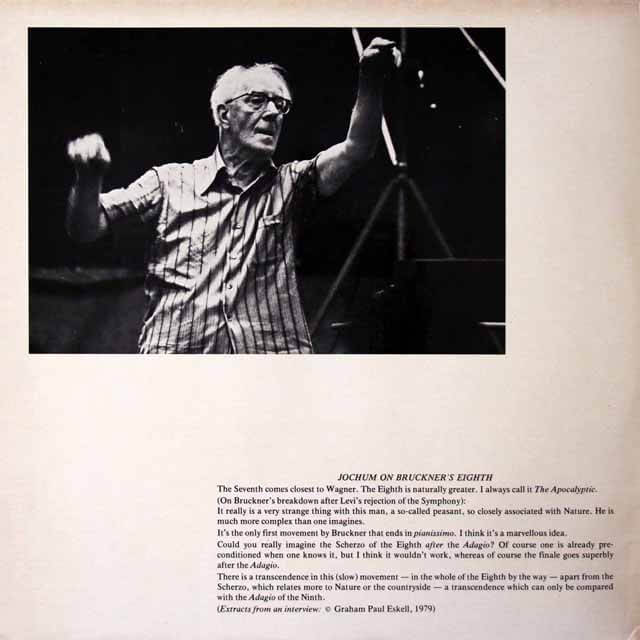 - オイゲン・ヨッフム(Eugen Jochum, 1902年11月1日〜1987年3月26日)は、バーベンハウゼン生まれ。アウグスブルク音楽院でピアノとオルガンを学び、1922年よりミュンヘン・アカデミーでハウゼッガーに指揮を学ぶ。1949年にバイエルン放送交響楽団の設立に関わり、音楽監督を1960年まで務め同楽団を世界的レベルにまで育てた。演奏スタイルに派手さはなく地味ではあるが、堅固な構成力と真摯な態度、良い意味でのドイツ正統派の指揮をする。やはり本領はバッハ及びロマン派音楽と思われる。彼は音楽を自己の内心の表白と考える伝統的ドイツ人で、したがってバッハ、ブルックナー、ブラームスに於いては敬虔な詩情を迸っている感動的な名盤を生むが、モーツァルトの本質を探ろうとするほどに湧き溢れて来るがごとき心理的多彩さや、ベートーヴェンの英雄的激情、それにリヒャルト・シュトラウスの豊麗なオーケストラの饒舌を表現するには乏しい結果となっている。ヨッフムがはたして、すでに成長すべき極言まで達してしまった人なのか、それともさらに可能性が期待できるのか、いつまでも巨匠の風貌に至らないのが、好感とともに焦燥を禁じえないが、おそらく同世代のカール・ベーム、エドゥアルト・ファン・ベイヌム、ヘルベルト・フォン・カラヤンたちに比べれば個性と想像力において弱く、名指揮者にとどまるのではないかと思われた。ところが、後年のヨッフムの録音活動の活発さは目を引いた。戦前のSPレコードでは、わずかにテレフンケンのベートーヴェンの「第7」「第9」ほどだったのと比べて、彼が晩年型の指揮者と称されることを簡易に理解できる面だろう。ベルリン放送交響楽団(1932~34年)、ハンブルク・フィルハーモニー管弦楽団(1934~49年)、バイエルン放送交響楽団(1949~60年)、ロイヤル・コンセルトヘボウ管弦楽団(1961~64年)、バンベルク交響楽団(1971~73年)とオーケストラ首席指揮者を務めた変遷を見ると、バイエルン放送響以外は短いのに気づくが、同時に2つのオーケストラを兼務することをしていないことも見て取れる。そうした、一つ一つの歴任を経て来たことは彼の律儀な性格のあらわれかも知れない。