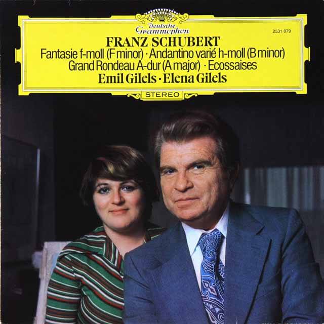 愛娘のエレーナ・ギレリスと録音した、一本の短編小説が想像出来るようなシューベルト ― 「幻想曲ヘ短調」は、フランツ・ペーター・シューベルト最期の1828年に作曲されたピアノ連弾曲です。シューベルトの30曲以上ある連弾曲の中でも、とりわけ高い音楽的内容をもつ傑作と言われています。連弾とは2人のピアニストが1台のピアノを低音と高音に役割を分担し演奏します。シューベルトの連弾曲の殆どはエステルハージー伯爵令嬢のマリーとカロリーネのピアノのレッスンのために作曲されています。この「幻想曲ヘ短調」(Fantasie f-Moll, 作品103, D 940)はシューベルトが恋心を抱いた伯爵令嬢カロリーネのために自分の思いを込めて作曲し、カロリーネに献呈されています。曲は全体的にやや暗い雰囲気の中に哀愁帯びたメロディとその変奏で全曲が進みます。単一楽章形式ですが全体は大きく4つの部分で出来ていています。静かに始まるイントロから、ドラマチックで訴えかけてくるような旋律が惜しげもなく繰り出され、約18分半の長尺曲であるにも関わらずあっというまに過ぎ去ってしまいます。歌曲王のシューベルトだけあって、メロディだけのピアノ曲であっても物語性が濃厚なせいか、一本の短編小説が想像出来るような造りになっています。昨日のモーツァルトの「2台のピアノのための協奏曲」をさらに親密になっているようで、シューベルトの音楽を挟んで、数々の思い出話を対話しているようだ。エミール・ギレリスが愛娘エレーナと連弾を披露した1978年録音。飾っておきたいほどだ、ジャケットの表情が微笑ましい。2人の対話が弾んでいるようなだけでなく、「ラルゴ」から「アレグロ・ヴィヴァーチェ」へアップテンポ且つ熱情的に展開する箇所でもギレリス・デュオの息はピッタリで、ピアノ連弾の面白さが堪能出来ます。エミール・ギレリスは、西側で自由に活動することをソ連政府から許された最初の芸術家だった。誰が言い出したのか、ギレリスのピアノは〝鋼鉄〟と比喩され、彼の演奏は常にそのイメージ、いや先入観をもって聴かれてしまったように思います。しかしながら、この〝鋼鉄〟は、あまりにも一面的な評価にすぎません。ギレリスのピアノ演奏は、その内面からくる音楽解釈の深さと卓越した技巧により常に私たちを魅了し続けており、現在でも多くの音楽ファンは楽曲の本質的な演奏をギレリスに求めています。名ピアニストの故ギレリスは強靱なタッチで迫力ある演奏を聴かせるばかりでなく、とっても繊細でロマンティックな所もあり、その対比が絶妙で実に素晴らしい。ギレリスが亡くなった齢はまだ69歳で、演奏旅行に出かける直前の予防注射の接種ミスとも言われる不幸な事故での急死だった。米ロの冷戦の最中、西側登場以前、以後ともに豊富な録音が残されていますが、ギレリス50歳代後半、まさに脂の乗り切った絶頂期の録音で若い時から比類ないと云われてきた完璧なテクニック、ピアノを豪快に鳴らしきった明快な音はそのままに表現は一層深みを増している感じ。