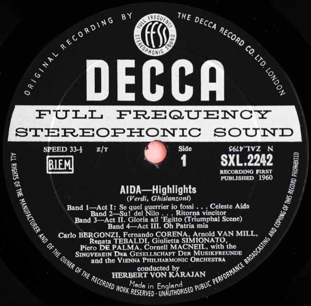 GB DECCA SXL2242 ヘルベルト・フォン・カラヤン カルロ・ベルゴンツィ コーネル・マクニール ジュリエッタ・シミオナート ウィーン・フィルハーモニー管弦楽団 ヴェルディ アイーダ 抜粋