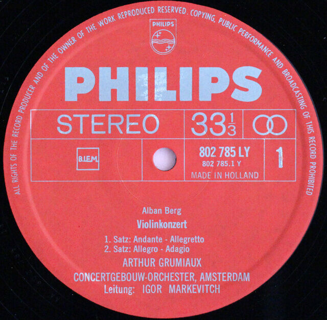 - アルテュール・グリュミオー(ヴァイオリン)、アムステルダム・コンセルトヘボウ管弦楽団、イーゴリ・マルケヴィッチ(ベルク)、エルネスト・ブール(ストラヴィンスキー)指揮。