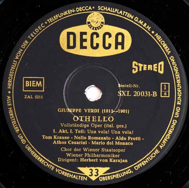 DE DECCA SXL20031/20033-B ヘルベルト・フォン・カラヤン マリオ・デル=モナコ レナータ・テバルディ アルド・プロッティ ウィーン・フィルハーモニー管弦楽団 ヴェルディ オテロ