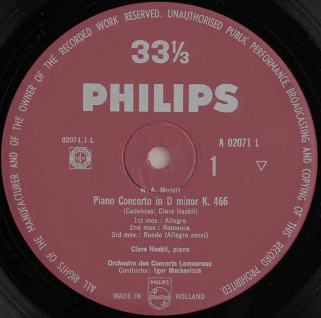 NL PHILIPS A 02071 L クララ・ハスキル イーゴリ・マルケヴィチ コンセール・ラムルー管弦楽団 モーツァルト ピアノ協奏曲20番 24番